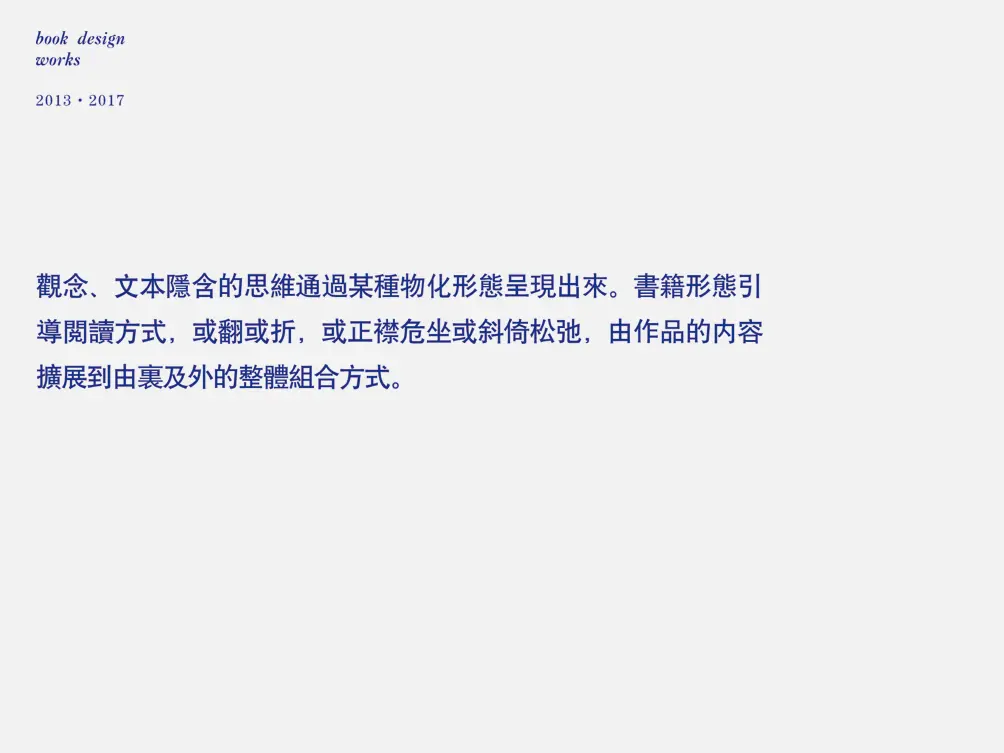 首先跟大家分享的是我工作室的一些书籍设计作品。在我的认知里,我觉得通过阅读的设计可以由目之所及的现状——也就是文本,去洞见文本内容指向的本真存在,去体验阅读的愉悦及其隐喻。书籍设计就是在一定程度上对阅读能见度的设造及建构,这个就是我接下来想讲的一点见解。