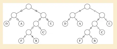 假设六个字母的频率为A 27,B 8,C 15,D15,E 30,F 5,合起来正好是100%。那就意味着,我们完全可以重新按照赫夫曼树来规划它们。