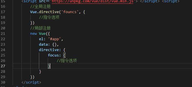 自定义指令的注册方法和组件很像,也分全局注册和局部注册,比如注册一个 v-focus 的指令, 用于在<input>、<textarea>元素初始化时自动获得焦点,两种写法分别是: