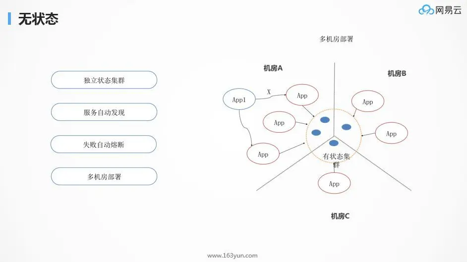 缓存。高并发应用需要每一层都有缓存,把客户需求尽可能地拦在前面,吞吐量就大很多。但缓存不像数据库一样有持久化机制,其高可用、跨机房就需要做双写,因为缓存保持在内存中,挂了就没有了,修复难度很大。其他的组件,比如ZooKeeper、Kafka、消息队列、HBase,都有各自的高可用机制。所以,一个发展中的应用应当被分成很显著的两个部分,一部分是无状态的,另一部分有状态的就放到本身具有高可用机制的组件里面。