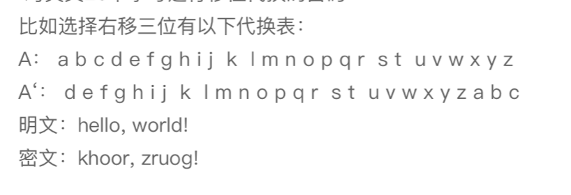 代换密码中最简单的是凯撒密码,它是一种单表代换密码,加密方式就是对字母通过位移进行加密,比如把字母表右移三位,上面是明文表,下面是对应的密文表。如下图所示: