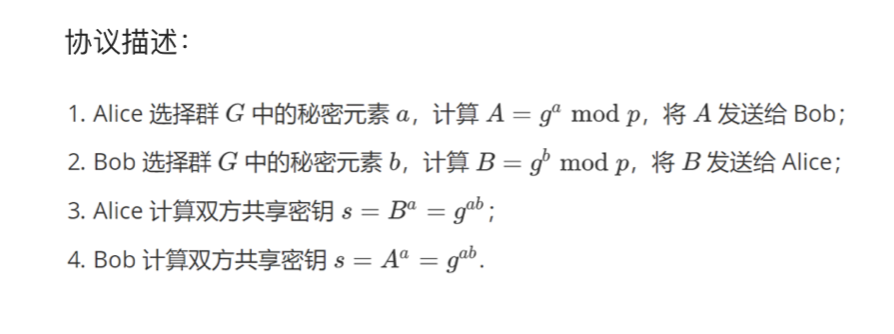 这个就是在1976年Diffie 和Hellman提出的密码学新方向中提出的协议,它主要解决的是秘钥分发问题,是公钥密码学的开端,然后它的安全性是基于计算Diffie -Hellman问题的困难性。