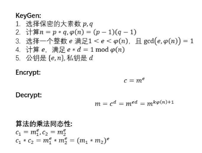 RSA算法是第一个公钥密码算法,也是第一个数字签名算法。具有乘法同态性,也可以称为第一个乘法同态特性的算法,它提出来的最早,也研究的最为广泛,因此也是理论上最成熟的密码学算法。
