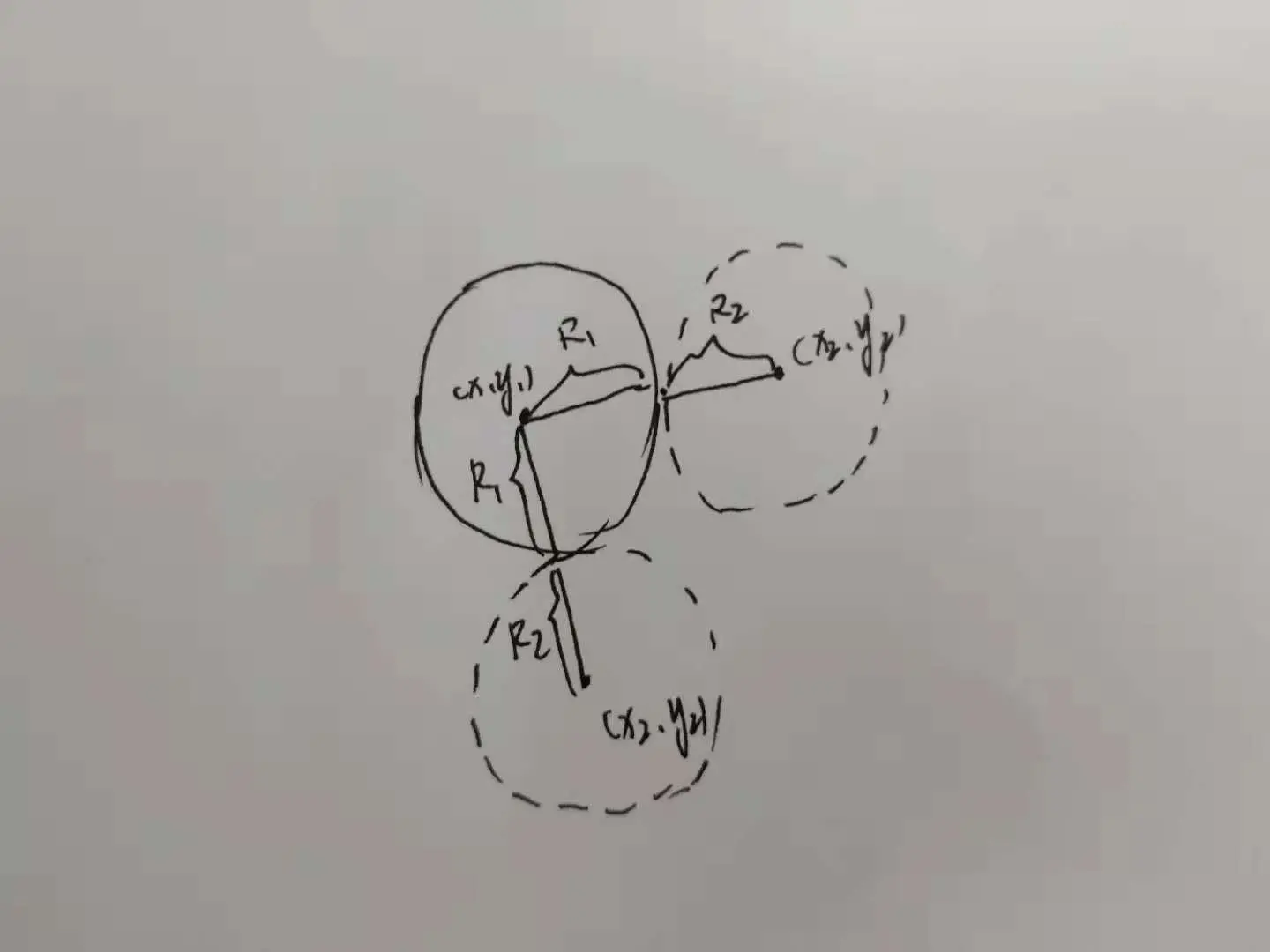 所以我们首先需要做的是计算出两圆心间的距离,这里我们将用到两点间的距离公式,如下: