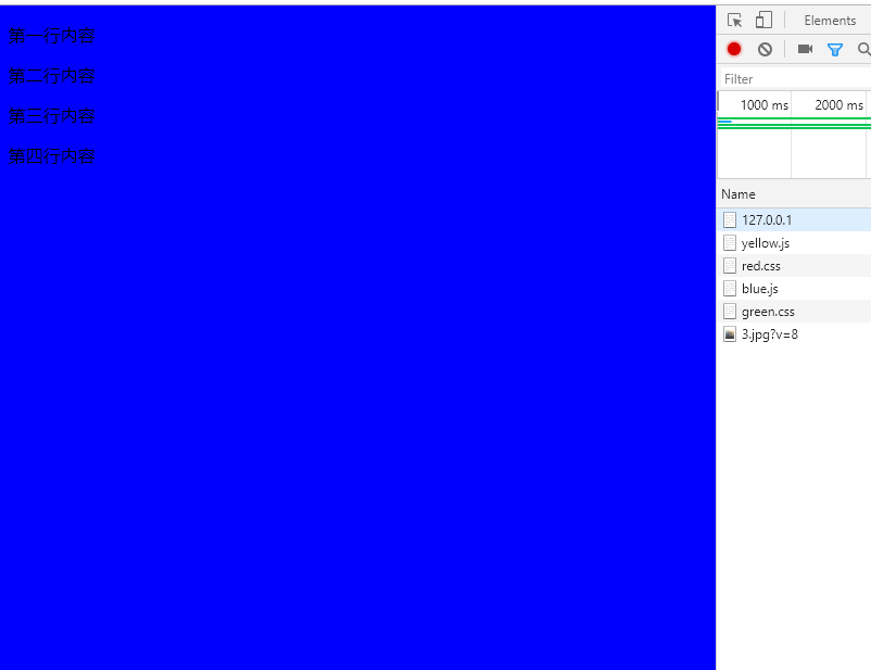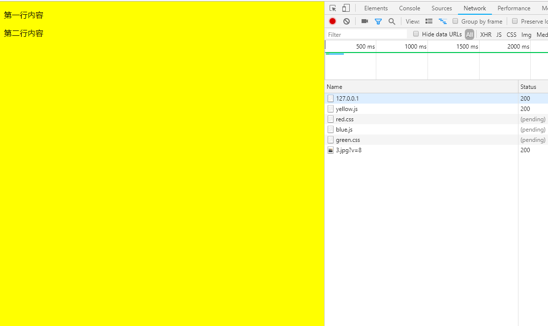 这里说明下:yellow.js 和 blue.js 下载时间分别为 5s 和 10s,red.css 和 green.css 下载时间分别为 15s 和 20s。测试浏览器为谷歌刘浏览器,版本 70.0.3538.102(正式版本)(64 位)