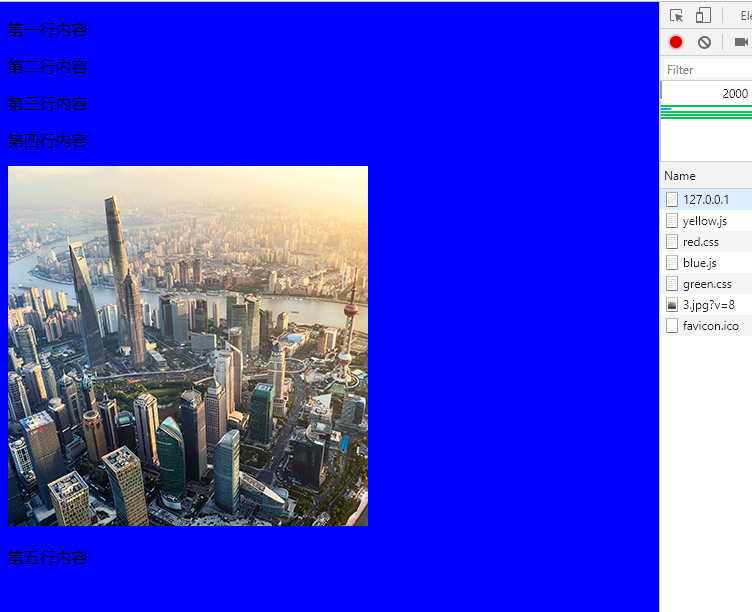 red.css是15秒左右下载完成,而blue.js是10秒左右下载完成,在浏览器中我们看到是这样的效果:blue.js比red.css先下载完成,但是blue.js并没有执行,等red.css加载完成后blue.js才会执行。这就符合了前面的规则二:css加载不会阻塞DOM树的解析,不会阻塞其它资源(如图片)的加载,CSS加载会阻塞DOM树的渲染,也会阻塞 JS 文件的执行。