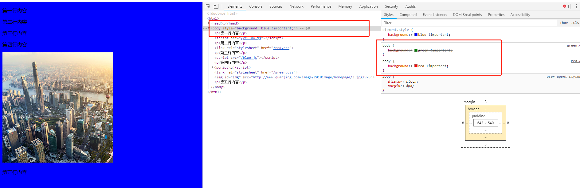 最后这里说明下为什么最后 body 的背景色没有变成绿色:因为 js 定义的样式在内联样式,优先级高于在 CSS 文件中定义的样式,所以不是 green.css 没有加载,而是没有生效。看下图就知道了:(green 和 red 样式都被划掉了)