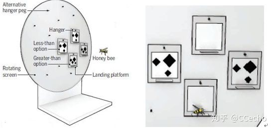 为了证明这一猜测,研究者将蜜蜂放置在一个可以自由飞行的空间中(如下图),对它们进行“小于”(less than)训练。通过对蜜蜂展示两张不同的图片,图片为白底和若干黑色图块组成。如果蜜蜂能够飞向图块数量较少的图片上,它们就能得到奖励,但如果它们飞错了就会尝到“苦头”(心疼1s)。当它们能够正确掌握游戏规则后,研究者就给它们一个新的刺激:没有任何图块的白底图片(哦豁!)。结果发现,仍旧有过半(64%)的试次它们会去选择空白的图片。它们懂得“0”小于2或者3,或者它们理解“0”比其他数都小。