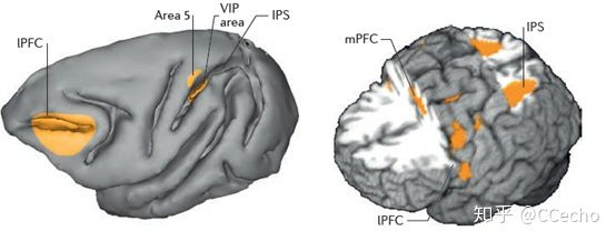 在过去的几十年中,人类通过训练动物掌握特定的行为模式发现鱼类、昆虫和哺乳类动物具有对数量变化的规则(如:加法)作出正确判断的能力。在一项训练猴进行数大小判别任务的研究中,研究者发现位于外侧前额叶皮层(LPFC)和顶内沟(IPS)的神经元对特定的数字具有选择性的反应,即更偏好对某个数产生反应。这两个区域在解剖学上是相互关联的,它们是进行数字处理的理想位置,因为LPFC和IPS区(主要其中的VIP区域)几乎是所有高度处理后的信息汇总点,这是抽象地表示数字的先决条件[1]。此外,它们与前运动区之间也存在联系可以指导个体行为的发生。相比人类群体中,尤其是脑区缺损的病患里(我们可不能把电极直接插进健康人的大脑中 ╮(╯▽╰)╭),发现额叶和颞叶区对数字加工具有重要的意义。一项对人类数字加工脑区的元分析研究发现,我们的下顶叶、IPS、额中下回、LPFC还有内侧前额叶皮层都参与数字的加工[2]。不难发现这与同为哺乳动物的猴类是相似的,这可能说明同目(灵长目)中生物的加工数字的脑区是解剖上同源的。