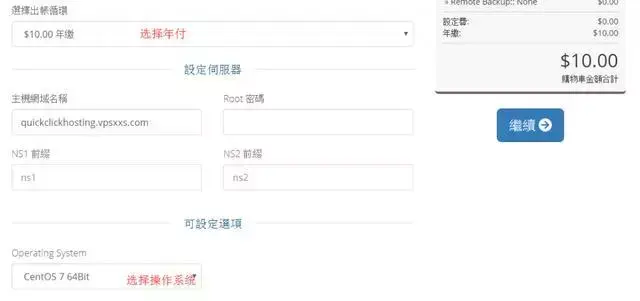 服务器这里选择年付,主机名随便写个网址,ROOT密码要自己记住,NS前缀就用NS1、NS2这样就行,然后选择自己习惯用的操作系统,其他附加配置不要选,直接点击右边蓝色的继续: