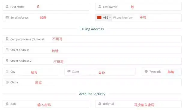 如图所示完善账户信息,使用拼音即可,电话手机那里之前要选择中国+86: