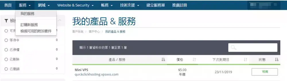 之后在导航“服务”-“我的服务”,这里就可以看到购买的VPS的信息了,可以看到是即时开通的,同时自己的注册邮箱也会收到邮件,里面有服务器的IP、端口等信息,到这注册就完成了。