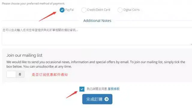 接下来选择支付方式,可以看到是支持paypal的,也可以选择是否订阅优惠通知邮件,同意服务条款后点击“完成订单”进行支付即可: