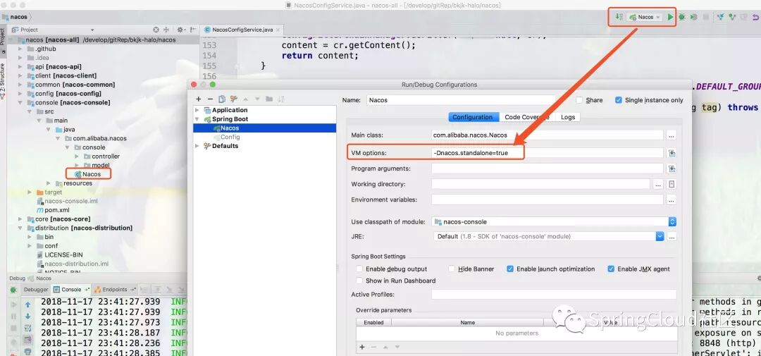 访问https://github.com/alibaba/nacos ,使用Git克隆Nacos代码,直接导入到IDEA中,如下所示设置启动参数,直接启动。