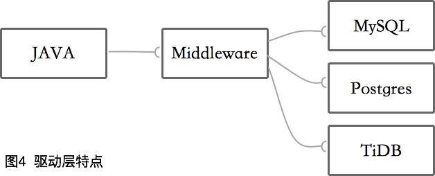 代理层中间件正好相反。仅支持一种后端关系型数据库,但支持多种开发语言。如果你的系统是异构的,并且都有同样的SLA要求,则推荐使用此方案。