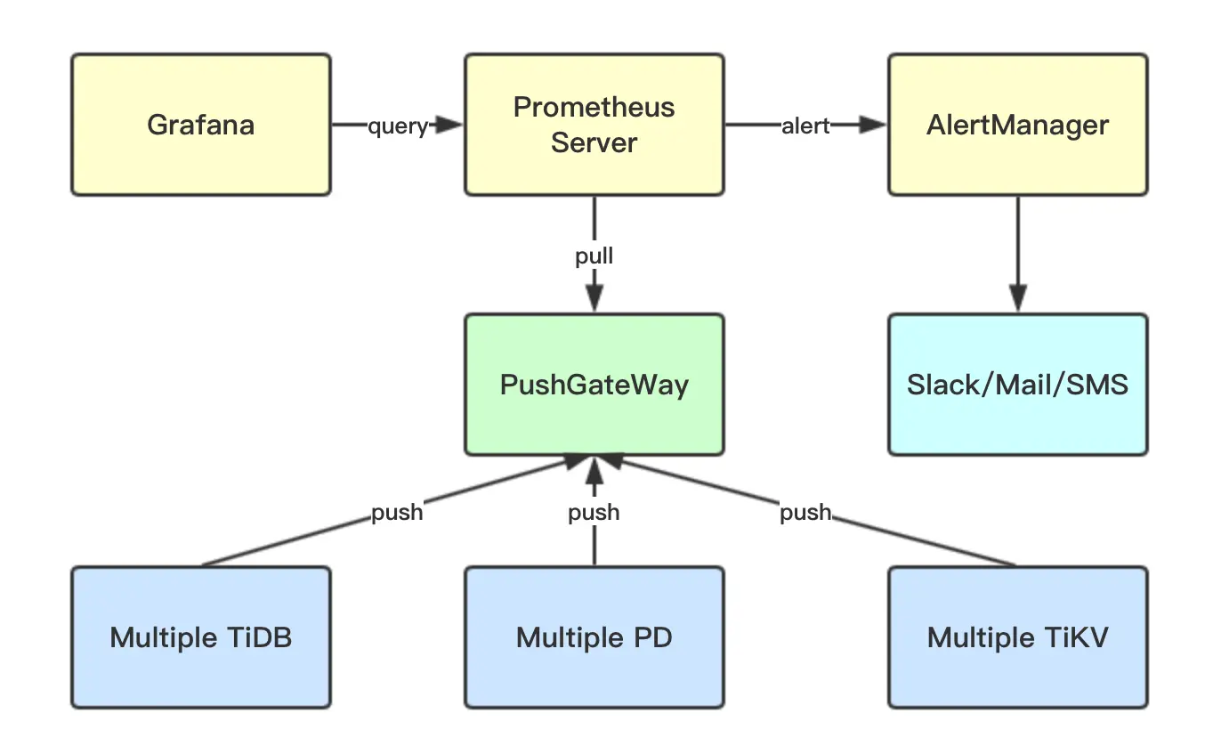 而 TiDB 有丰富的监控指标,使用流行的 Prometheus + Grafana,一套集群有 700+ 的 Metric。从官方的架构图可以看出,每个组件会推送自己的 Metric 给 PushGateWay,Prometheus 会直接到 PushGateWay 去抓数据。