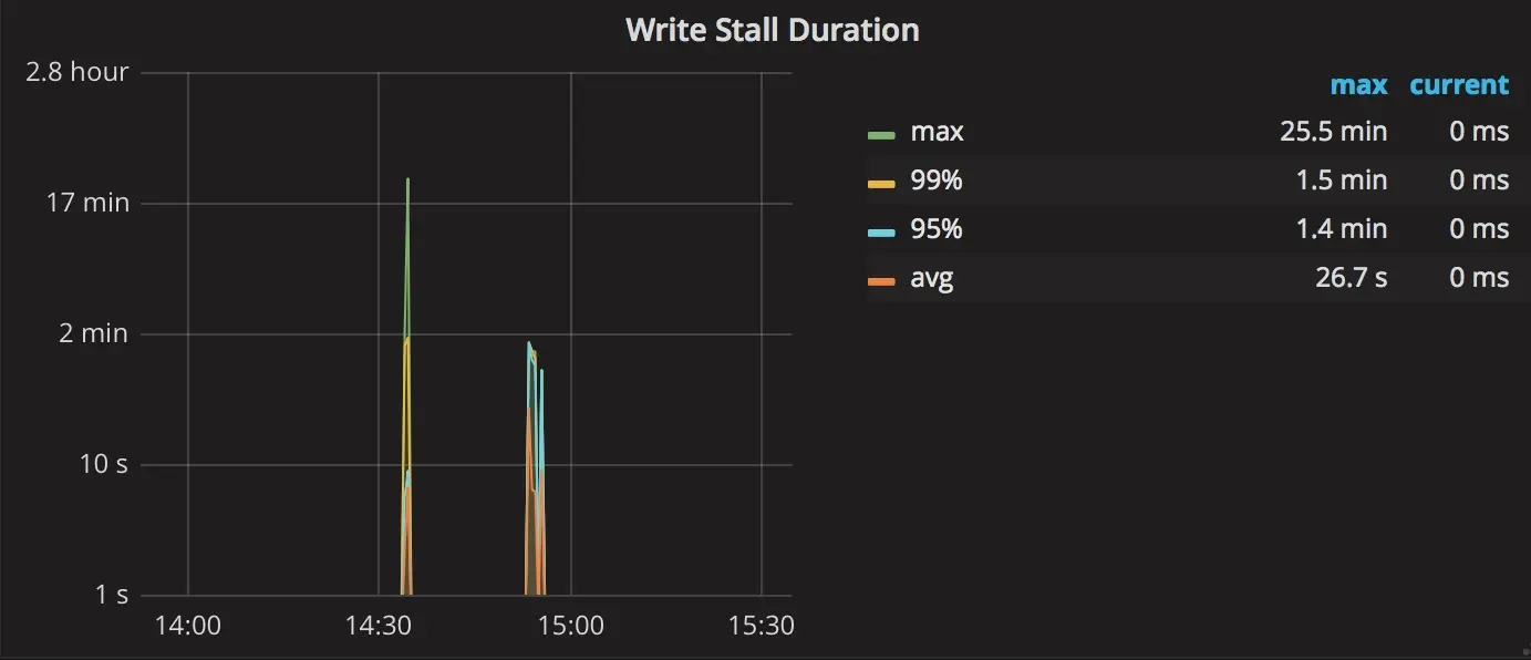 TiKV 底层有 2 个 RocksDB 作为存储。新写的数据写入 L0 层,当 RocksDB 的 L0 层数量达到一定数量,就会发生减速,更高则发生 Stall,用来自我保护。TiKV 的默认配置:
