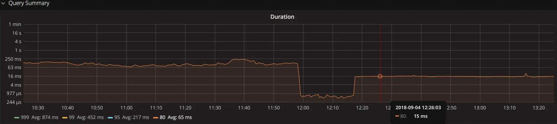 为了解决 region 过多的问题,我们在升级 2.1 版本后,开启了 region merge 功能,但是 TiDB 的响应时间 80 线(Duration 80 By Instance)依然没有恢复到当初,保持在 50ms 左右,排查发现 KV 层返回的响应时间还很快,和最初接近,那么就定位了问题出现在 TiDB 层。研发人员和 PingCAP 定位在产生执行计划时行为和 2.0 版本不一致了,目前已经优化。