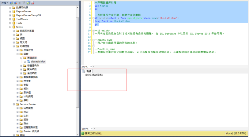 示例结果:使用T-SQL脚本删除函数之后需要刷新查看删除结果,依次显示删除命令执行结果和删除结果。