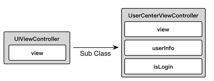 例如下图中,父类是UIViewController,具有一个view属性。子类UserCenterViewController继承自UIViewController,并定义了两个新属性。这时如果通过子类创建对象,就会同时包含着三个实例变量。