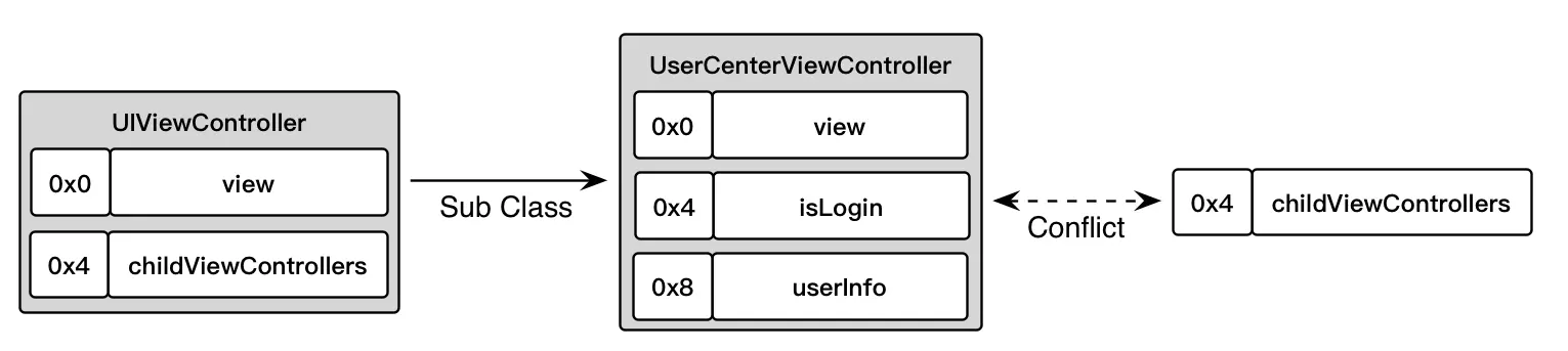 原来UIViewController的结构中增加了childViewControllers属性,这时候和子类的内存偏移就发生冲突了。只不过,Runtime有检测内存冲突的机制,在类生成实例变量时,会判断实例变量是否有地址冲突,如果发生冲突则调整对象的地址偏移,这样就在运行时解决了地址冲突的问题。