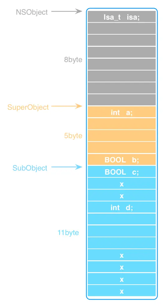 以上图为例,创建的对象中包含所属类及其继承者链中,所有的成员变量。因为对象是结构体,所以需要进行地址对其,一般OC对象的大小都是8的倍数。