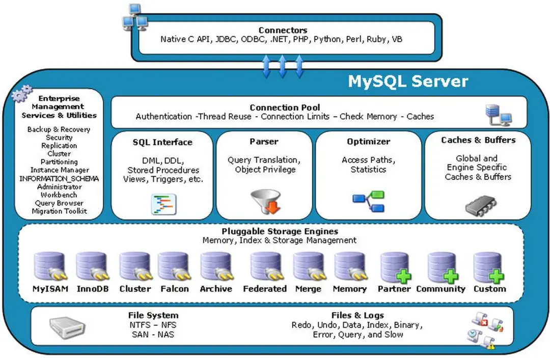 这是一张非常经典的Mysql的系统架构图,通过这个图可以看出Mysql各个部分的功能。