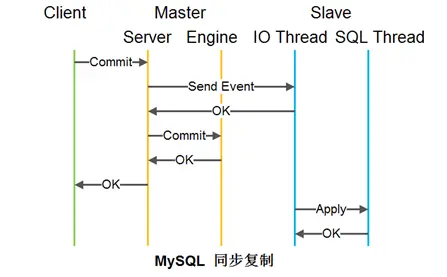 如图是主从异步复制的流程图。在主实例写入引擎后就返回成功,然后将事件发给从实例,在从实例上执行。这种同步方式速度较快,但是在主挂了的时候,如果还没有复制,则可能存在数据丢失问题。
