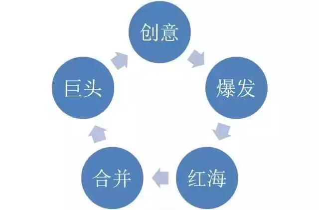 首先要有个人有个创意,做一个没有的产品或发明一种没有的商业模式,当创意得到市场认可的时候,就迎来了市场的爆发,大家纷纷涌入,做同质化的产品,将一个新兴的市场变成一个红海,在红海中进行生死较量,有的退出了,有的倒闭了,有的被兼并,最终只能剩下两三家,或者成为巨头,或者被巨头收购。