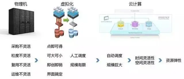 虚拟化技术解决了这个问题,点即可得解决采购灵活性问题,可大可小解决粒度灵活性问题,即创即销解决复用灵活性问题,界面运维解决运维灵活性问题。唯一没有解决的问题是调度灵活性,需要手动运维,因而规模有限。