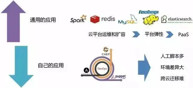 我们把应用分成两种,一种叫做通用的应用,例如这里面写的Spark,Mysql,Hadoop,这些应用的特点是通用,谁安装都一样,但是运维起来又相对比较复杂,应该交给云平台去运维和扩容。另一种叫自己的应用,这些应用的安装云平台无法帮到你,因为你自己的应用只有你自己知道怎么安装,所以云平台往往提供了一些基于脚本的工具来做这些事情,例如Chef、Puppet、Ansible等。但是脚本有一个最大的弱点,一旦环境有差异,脚本就很难顺利运行成功,所以导致基于脚本的安装工具,实现跨云迁移非常困难。