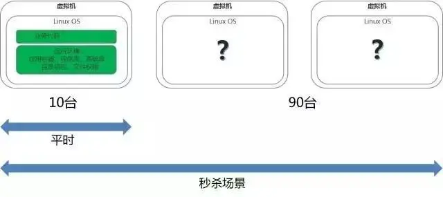 但如果云计算不管应用,则会是什么样呢?例如平时我们只需要十台虚拟机,但是双11的秒杀场景,我们需要一百台虚拟机,有了云计算资源层面的弹性,我们只要在云平台上一点,很快90台虚拟机就创建出来了,但是里面的应用呢?