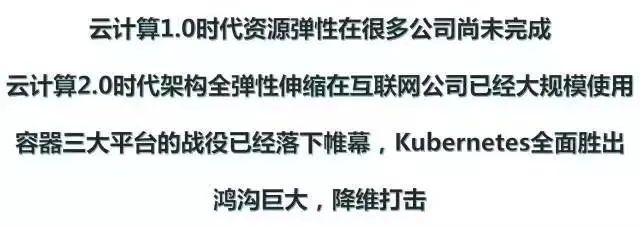 在这里暂时总结一下,虽然从技术角度来讲,容器已经成为一个趋势,然而在真正的实施过程中,云计算1.0时代,将应用云化的过程,很多传统公司尚未完成。然而,在大型的互联网公司,基于容器的云计算2.0技术实现架构的全弹性伸缩,已经在大规模使用。容器的三大平台战役已经落下帷幕,Kubernetes已经全面胜出,现在在互联网公司的论坛中,再讲容器技术,已经感觉是很老套的技术了,然而在很多传统企业,云化却尚未完成,这中间鸿沟巨大,利用容器技术的快速迭代,将是对还未进行云化的公司的降维打击。