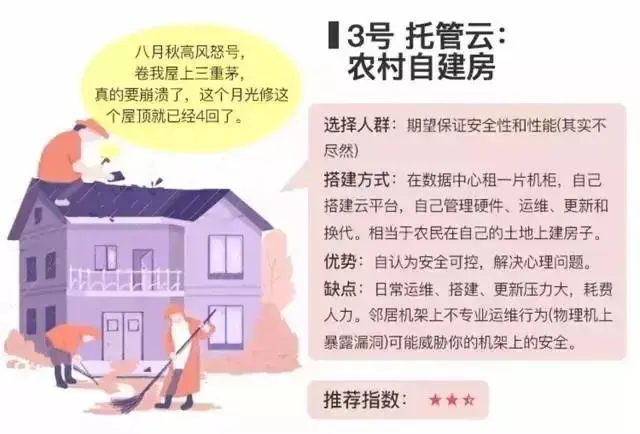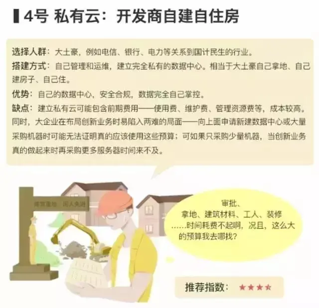于是有很多公司就想建设自己的私有云,把这比喻成为住别墅,其实这顶多是农村自建房,因为你可能需要去别人的数据中心里面租一块地,然后或者自建云平台,或者招标云平台。没有人会去想住别墅的时候,自己拿地自己去盖,自己出了问题自己去修,这样部署运维更新,成本非常的高,你需要自己养一个专业的运维团队来做这件事情。