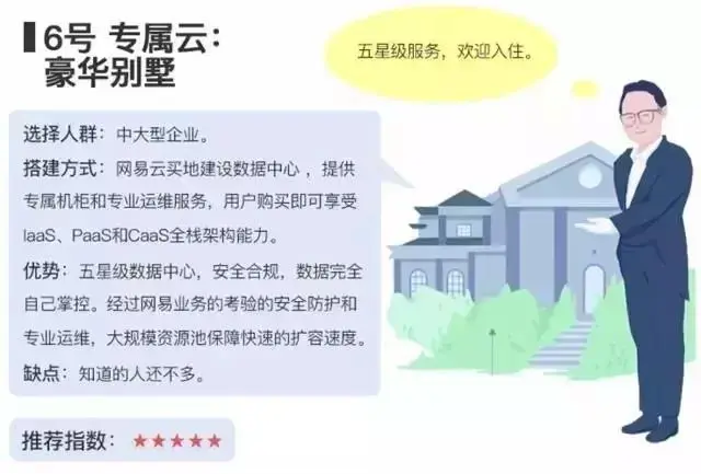 网易云专属云服务,商业别墅型云服务。地网易来拿,房子网易来盖,物业网易来管,保安网易来招。相当于在网易的机房里面,划出一块地方来,这个地方上面部署的云平台资源全是你自己的,但是硬件、网络、安全、安装、升级、修复,你都不用来管,有非常专业的运维团队来做这件事情,这些运维操作保证安全合规,你只需要关注自己的应用就可以了。
