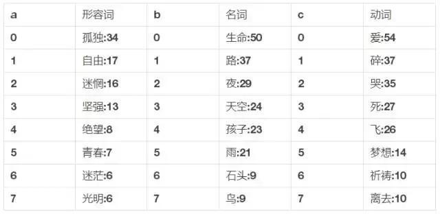 有一位网友统计了知名歌手在大陆发行的 9 张专辑中 117 首歌曲的歌词,同一词语在一首歌出现只算一次,形容词、名词和动词的前十名如下表所示(词语后面的数字是出现的次数):