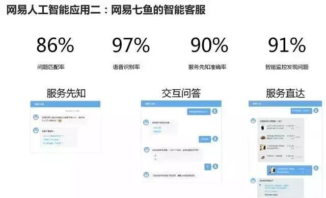 网易人工智能的第二个应用就是七鱼全智能云客服,也是从第一代的关键字匹配,到后来基于概率的NLP,和基于深度学习神经网络的第三代,逐渐发展到今天的。