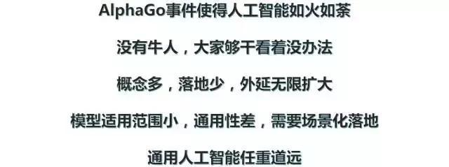 其实目前深度学习形成的模型,适用范围非常小,通用性相对比较差,往往只能干某一件特殊的事情,例如我们如果有很多电商的数据,我们就可以用来做客服,但是客服性质的模型不能用来反垃圾,我们有很多邮箱反垃圾的数据,可以训练出检测垃圾数据的模型,但是这个模型就不能用于推荐音乐,所以通用的人工智能还任重道远,当前在工业界需要找到非常聚焦的场景化落地,才能让人工智能尽快应用起来。
