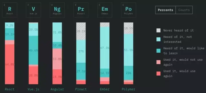 StateOfJS 表示,两年前有 27% 的受访者表示从未听说过 Vue ,但如今这一比例已降至 1.3% !虽然 React 仍然拥有更大的市场份额,但 Vue 的迅速崛起也没有停止的迹象。