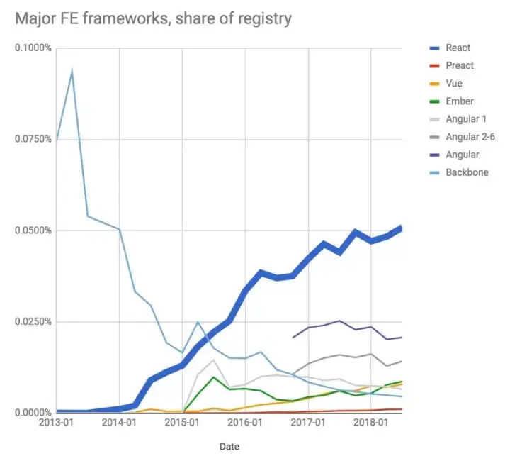 Vue 则一直保持着稳定的增长率,它在保持可扩展性的同时更容易上手。npm 团队表示,React 今年增长速度较慢可以解释为有更多的新用户选择了 Vue 而不是 React 。