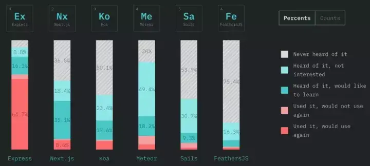 JavaScript 在后端(服务端)领域近年来似乎没有取得任何重大突破,虽然每年都有无数的框架出现,但很少有能够获得很大的成功并挑战 Express 的地位的。 即便是拥有 Express 继任者称号的 Koa ,其满意度也相对较低,使用量也有大幅下滑。