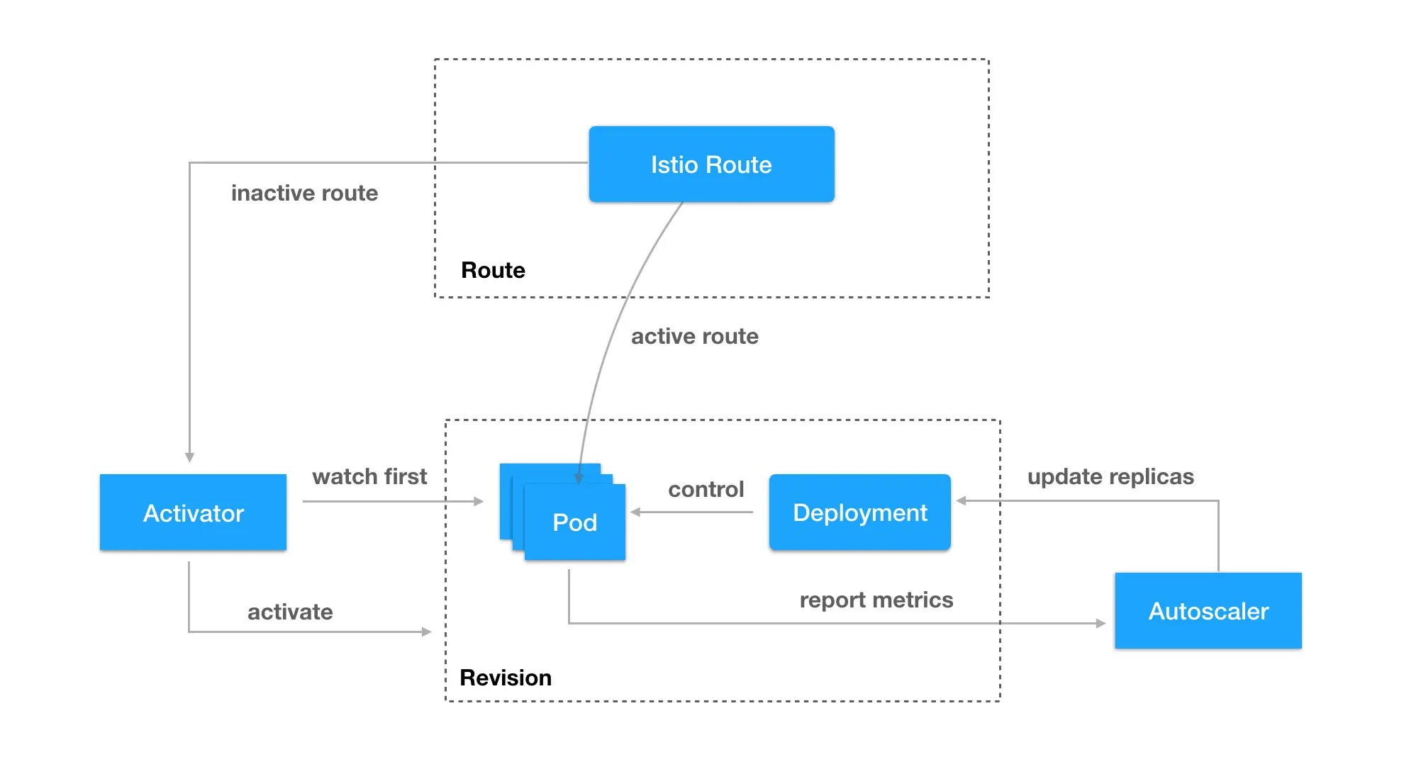 Knative Serving 功能是基于 Kubernetes 和 istio 开发的,它使用 Kubernetes 来管理容器(deployment、pod),istio 来管理网络路由(VirtualService、DestinationRule)。