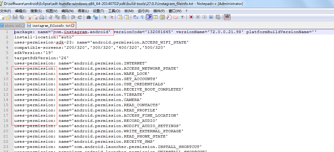 此命令用于查看APK包的packageName、versionCode、applicationLabel、launcherActivity、permission等各种详细信息,请记录应用uses-feature和uses-library项
