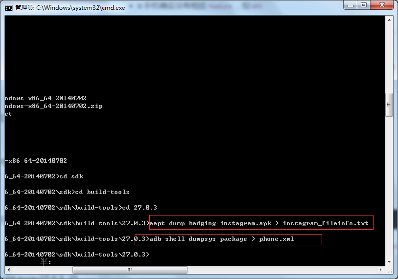 adb shell dumpsys package > 某某.xml