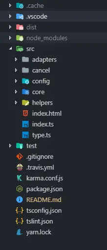 目录与 Axios 基本保持一致,core 是 Axios 类的核心代码。adapters 是 XHR 核心实现,Cancel 是与 取消请求相关的代码。helpers 用于放常用的工具函数。Karma.conf.js 及 test 目录与单元测试相关。.travis.yml 用于配置 在线持续集成,另外可在 github 的 README 文件配置构建情况。