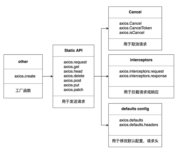 重构的思路首先是看文档提供的 API,或者 index.d.ts 声明文件。 优秀一点的源码可以看它的测试用例,一般会提供 API 相关的测试,如 Axios API 测试用例 ,本次分享实现 API 如下: