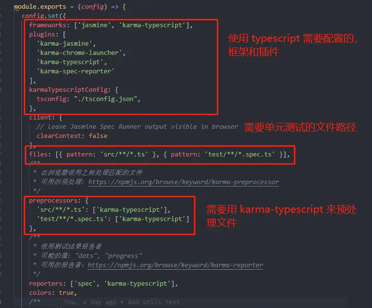 karma 会跑 test 目录下的所有测试用例,感觉测试用例用 TypeScript 来写,有点难受。因为测试本来就是要让参数多样化,然而 TypeScript 事先规定了数据类型。虽然可以使用泛型来解决,但是总觉得有点变扭。