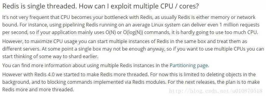 **警告2:**在上图中FAQ中的最后一段,表述了从Redis 4.0版本开始会支持多线程的方式,但是,只是在某一些操作上进行多线程的操作!所以该篇文章在以后的版本中是否还是单线程的方式需要读者考证!