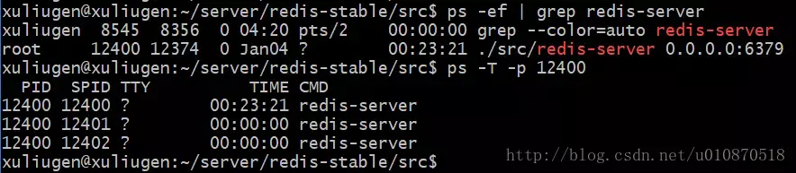 **警告1:**这里我们一直在强调的单线程,只是在处理我们的网络请求的时候只有一个线程来处理,一个正式的Redis Server运行的时候肯定是不止一个线程的,这里需要大家明确的注意一下!例如Redis进行持久化的时候会以子进程或者子线程的方式执行(具体是子线程还是子进程待读者深入研究);例如我在测试服武器上查看Redis进程,然后找到该进程下的线程: