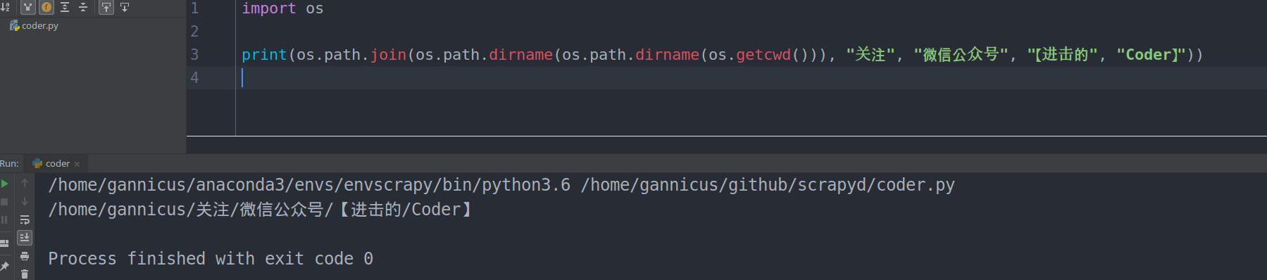 print(os.path.join(os.path.dirname(os.path.dirname(os.getcwd())), "关注", "微信公众号", "【进击的", "Coder】"))